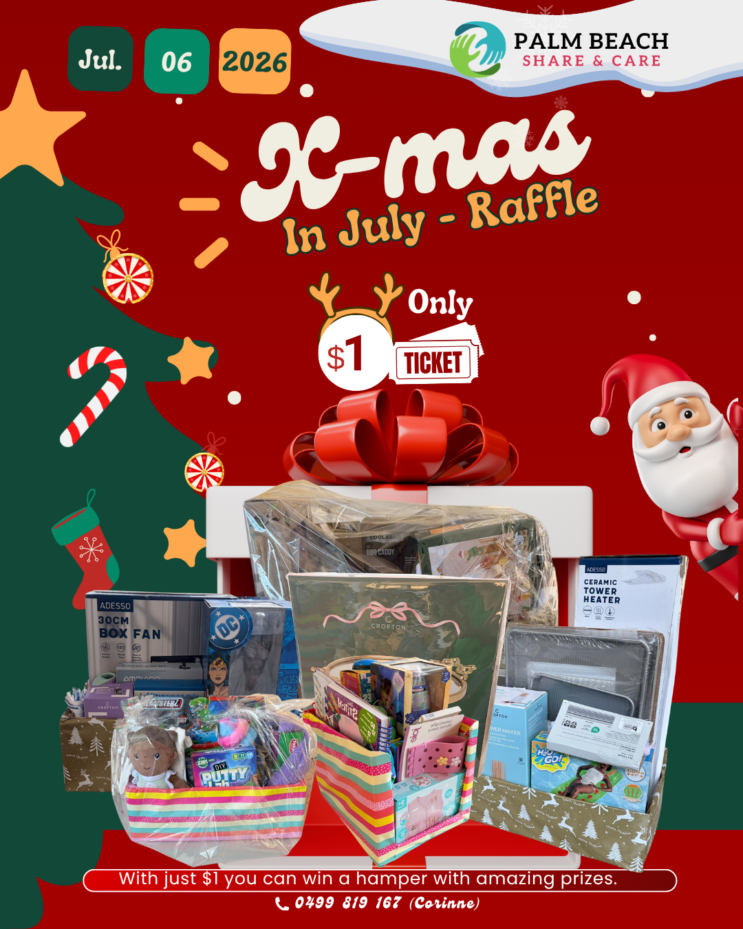 Here at Palm Beach Share & Care, this date holds an even deeper meaning, it’s a moment of togetherness, joy, and connection with our senior community. And we are delighted to announce that our Xmas in July Raffle is officially open! It’s a tradition that always brings smiles, excitement, and plenty of fun to everyone involved.